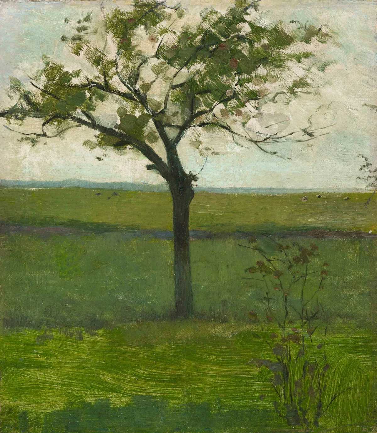 From 1890 to 1912, Mondrian painted dozens of trees. He started with full-color, realistic trees in context: trees in a farmyard or a dappled lane. Gradually he removed leaves, depth, color and eventually even branching from his tree paintings. “Gray Tree” uses only curved lines of various thickness superimposed on top of one another at seemingly random angles. Yet the image is unmistakably a tree.
